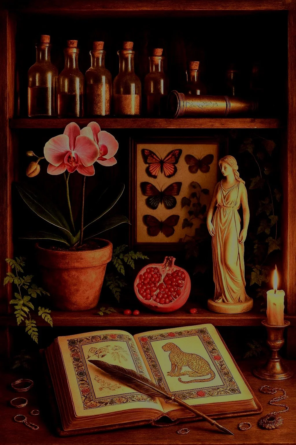 The Grimoire is where I keep the beautiful trouble—poems that taste of unfinished business, spells that smirk, unfinished sketches from dreamed up oracle decks, and rough draft chapters that escaped my memoir and refuse to return quietly. Here lives the raw stuff, caught in the act of becoming—before it’s shaped into artifacts of insight and awe.